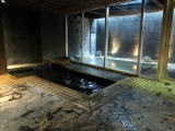 ●湯使いは掛け流しのようで、やや褐色に濁ったお湯が縁から静かに溢れています。土類系のお湯からは甘いような香ばしい匂いがします。少しなめてみると明確なサビ味を感じました。また、茶色い湯の華が舞っているのが確認できます。