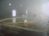 ●崖ぎわの岩肌をそのまま利用した内湯(大浴場岩風呂)は、遠くが霞んで見えないほどの湯気が立ちこめ、雰囲気は抜群です。熱めの大きな浴槽と、温めの小さな浴槽が並び、その浴室の奥には飲泉場もあります。源泉そのものはほぼ透明ですが、口に含むと軽いエグ味と鉄分を感じます。内湯が緑土色となっているのは、源泉に多少の鉄分を含むためでしょうか。なお、洗い場付近には天然水を飲むこともでき、長湯して喉が渇いたときにいいです。