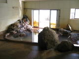 巨岩を配した内湯には、加水ながら褐色の薄濁りのお湯が溢れています。