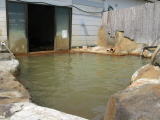 ●幾つかの巨岩が配置された内湯があり、サッシ窓の向こうには大きめの露天風呂があります。内湯と露天風呂は繋がっているので、内湯からジャブジャブ歩いて露天風呂に向かいます。青空のもとの露天風呂は陽射しが眩しく、とても気持ちの良いものです。内湯は褐色の薄濁りで、露天風呂はこれよりもさらに濁っています。おそらく酸化の度合いの違いでしょう。
